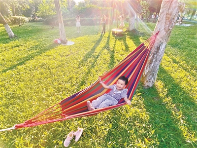傍晚时分,番禺大夫山公园的草地被染上了一层金色,前来休闲的市民三五成群,在湖光山色中享受开始变得温柔的秋阳。看,躺在吊床里的小朋友笑得多开心。 广州日报全媒体记者高鹤涛摄