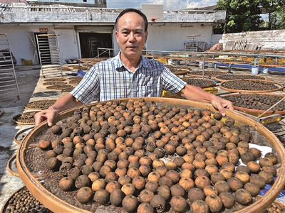 如今,梁金维成为了“广祥丰”的传承人,在新会双水镇“大围塘”有300亩柑园。在双水镇的陈皮加工场,初秋时节,在敞大的空地上,一个个支架上,放着一个个饱满的“小青柑”,这些“小青柑”均是采用传统工艺,天然干晒而成。