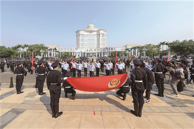 广州日报讯 (全媒体记者王名润 通讯员顺公宣、周婷)旌旗猎猎展雄风,誓言铿锵激斗志。昨日上午,佛山市顺德区公安局在大良街道德胜广场举行“护航党的二十大”安保誓师大会,全面吹响了夏季社会治安打击整治“百日行动”决战决胜的冲锋号角,展现出顺德公安派出所“两队一室”改革后焕然一新的精神面貌。