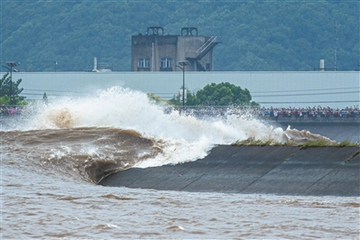 为方便游客观潮,杭州市水文水资源监测总站把钱塘江潮汐观赏等级分为五级,杭州萧山美女坝观潮点是预报中的五级最佳观测点,能观测到“回头潮”的壮观景象。上图为潮水冲击杭州萧山美女坝形成巨浪。