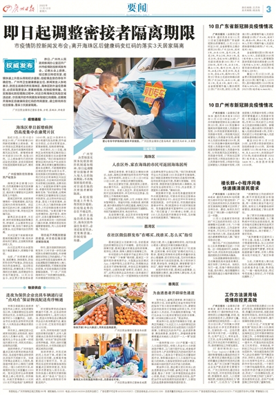 11月9日,荔湾区、番禺区发布关于强化社会面疫情防控措施的通告。包括严格控制人员流动,市民原则上非必要不外出和实行临时交通管控等措施。自11月10日起,除南沙区、从化区、增城区外,广州8区中小学阶段学校暂停线下教学,开展线上教学;高三年级有住宿条件的,在校实施全封闭管理;幼儿园暂停返园;校外培训机构暂停线下教学;托管、托育机构暂停服务,在穗高校实施封闭管理。海珠区从11月11日0时至13日24时,进一步强化疫情防控措施。