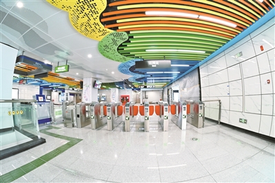 欢乐海岸站的站点特色,和它的名字一样,充满了欢乐和缤纷的浪漫。该站以站点周边景点乐园文化IP为载体,把“缤纷时光”作为设计主题,提取了站点文化IP缤纷元素及海岸线的曲线元素,以层层叠级的形式呈现。站点的设计、缤纷色彩的装潢,犹如一道彩虹悬挂在头上,让乘客还没出站就已置身于主题游乐公园的欢乐气氛中。走在五彩斑斓的“彩虹”里坐地铁,别有一番风味。