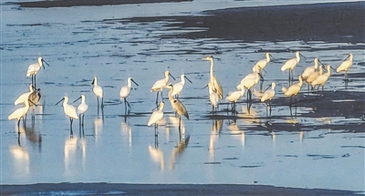 今年元宵节前夕,摄影师谭成伟来到银湖湾湿地新洲围西堤附近海滩上,看到数万候鸟在此翩翩起舞。这里有喜欢“跳舞”的黑嘴白鹭,有通体白色长嘴呈浅黄的黄嘴白鹭,有体态娇小的反嘴鹬,还有国家一级保护动物——黑脸琵鹭。更为惊喜的是,国家一级保护动物——白鹳也在此出现。这些候鸟在红树林上眺望大海、傲翅长空、贴水嬉戏,千姿百态,美不胜收。