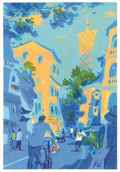 “从北方来到广州生活,广州的烟火气一直给我带来源源不断的灵感,她时而是焦糖色的,时而是蓝绿色的,跟随着时代的脚步日新月异。我用水粉、彩铅、蜡笔等综合材料创作出了心目中的广州,这七彩的人间烟火。”