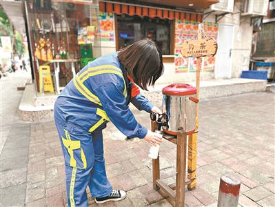 “我和同事经常来这里接茶水。”黄作军告诉记者:“体育西横街保洁班组有20人,负责的保洁面积约26万平方米,路面保洁、垃圾收运、清理路面积水等,还有环卫设施的擦洗,环卫工具房的清扫消毒,这些都是我们平时做的工作。作业面积大,保洁任务重。”