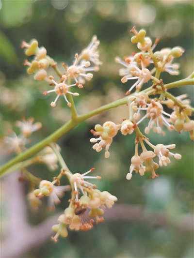 无独有偶,在樟木头观音山下,果林里花儿挂满枝头,蜂儿嗡嗡振翅,在花间采蜜忙。72岁的养蜂人老马很忙,他在山下采收荔枝蜜已超过30年。老马说,樟木头荔枝成林,蜜源丰富,每年在这里都能有不错的收获,天气晴好时一个月下来可以打两千来斤荔枝蜜。据悉,每年4月,是樟木头荔枝花的盛放时节,不少养蜂人抢抓有利时机放蜂采蜜,镇内不少荔枝园都能见到他们的身影。