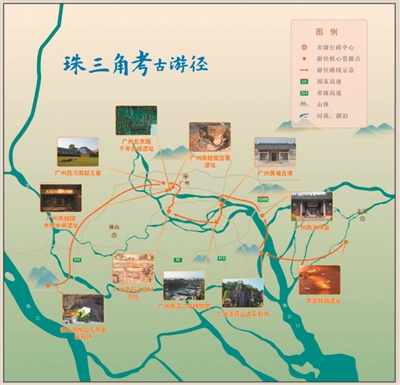 珠三角考古游径:东莞蚝岗遗址——广州莲花山古采石场——佛山西樵山石燕岩采石场——广州南越国宫署遗址——广州南越国木构水闸遗址——广州西汉南越王墓——广州北京路千年古道遗址——广州南汉二陵博物馆——广州南海神庙——广州黄埔古港——广州南石头监狱旧址(左图为游径效果图)