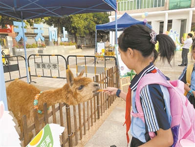 萌娃与萌宠,可爱两相逢——长安镇厦岗小学的开学典礼,别出心裁安排了小动物们当“迎宾使者”,羊驼、马、兔子、鹿、羊……孩子们亲手喂一把食,这是新奇的体验。