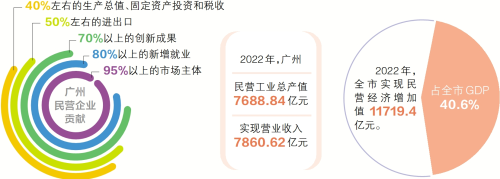 在广州,95%以上的市场主体,80%以上的新增就业、70%以上的创新成果、50%左右的进出口、40%左右的生产总值、固定资产投资和税收均由民营企业贡献。民营企业活力迸发,目前广州民营经济增加值已破万亿元,2022年,全市实现民营经济增加值11719.4亿元,占全市GDP的40.6%。