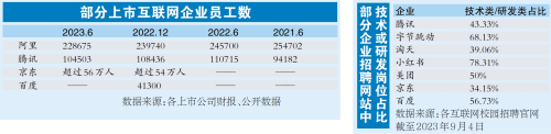 一方面是大规模招聘,而另一方面,截至今年6月,部分上市互联网企业人数相比过往有缩减。以阿里与腾讯为例,据财报、公开数据显示,截至2023年6月,阿里与去年年底相比减少了近一万多人;腾讯则减少了4000余人。比去年同期,阿里减少1.7万多人;腾讯则减少了6000多人。