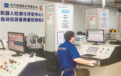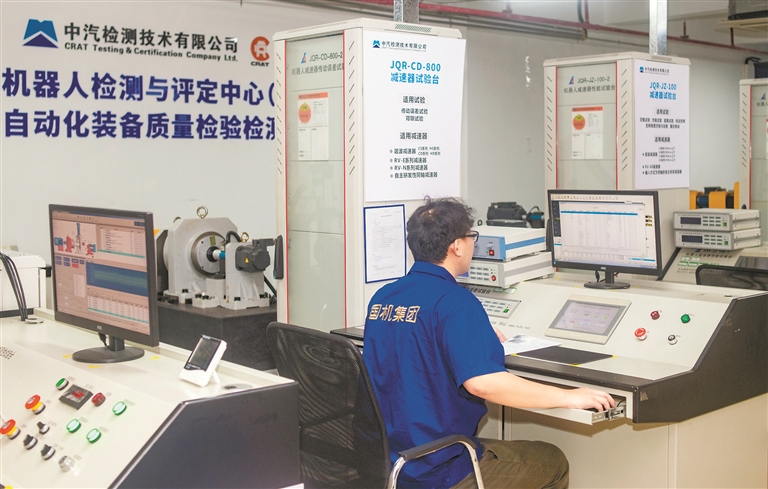 在位于黄埔区国机智能-中汽检测技术有限公司的机器人关键部件试验室,记者看到,检测人员正在为减速器进行寿命耐久度检测,“这个耐久度检测项目要至少进行三个月。”检测人员说。