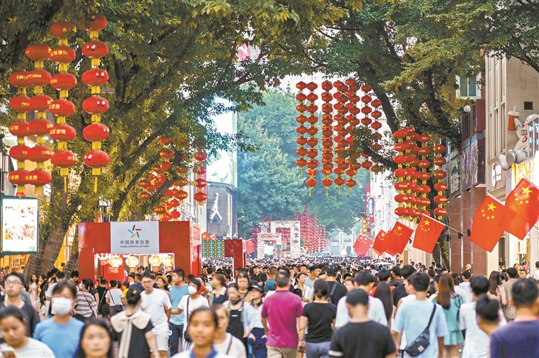 “从假期首日开始,这里的客流就络绎不绝”,近日,家住北京路的市民温女士外出聚餐时发现,位于北京路商圈的广百百货等商场的收银台前都大排长龙,在政府消费券的助推下,商场热度更是“爆表”。中秋国庆“双节合一”叠加亚运热潮,近日来“假日消费”的热度一路上扬,带来一个精彩不断的“黄金周”。