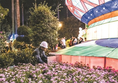 9月30日20时,正是广州文化公园人流量最大的时候,从1956年就开始陪伴市民的中秋灯会再度亮灯,吸引市民游客纷至沓来。公园电工班班长何伟杰身着一身蓝色工衣,穿过熙熙攘攘的人群,来到最大灯组《繁花似锦绽华章》下方,搬开花盆,到隐蔽的灯组开关处,检查电流安全。流光溢彩,火树银花,在市民游客赏花灯、享团圆的美好时刻,何伟杰却没能与家人团聚,他必须留在岗位上做好中秋灯会的电力保障工作。