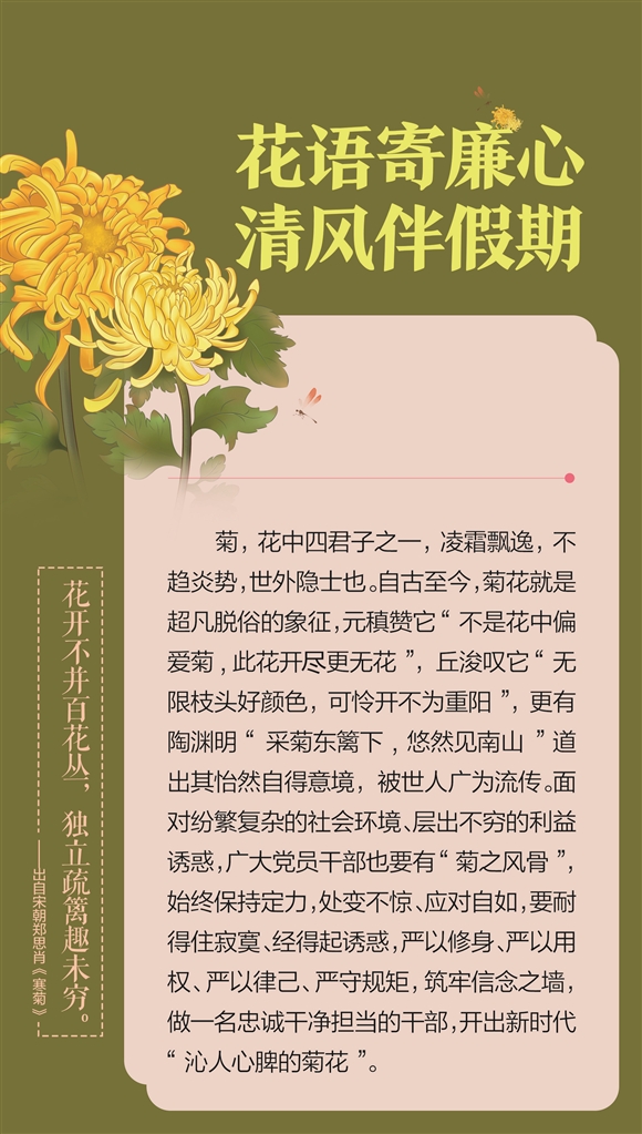 又是一年中秋、国庆假期,越到重要节点,越要提高警惕,为进一步严明纪律规矩,筑牢“节日防腐墙”,拧紧“节日清廉关”,广州日报在假期期间推出《花语寄廉心 清风伴假期》系列主题海报,每日送你一束“廉洁花”,愿我们如花般纯洁,永保澄澈内心,守住清廉底线,欢度一个风清气正、廉洁健康的节日假期。