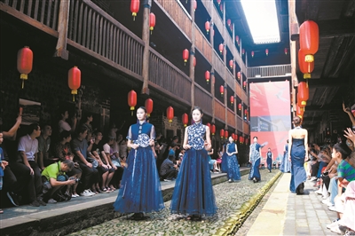 在展演现场,走秀表演爱好者大方自信地进行服饰展示,各有风范,仪态或古典婉约或摩登时尚,与有着独特魅力的“客家蓝”时装相得益彰,一道靓丽的风景线就此精彩呈现。