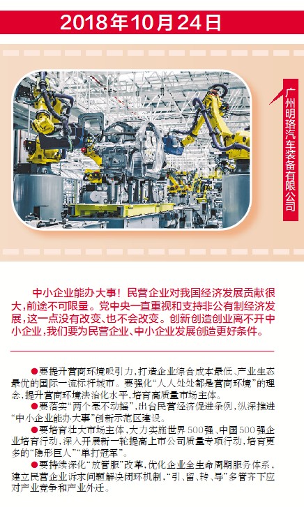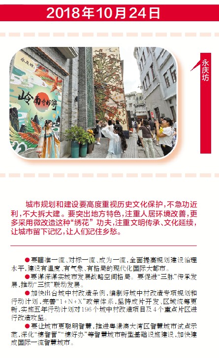 广州不会忘记,五年前这个日子——10月24日,在永庆坊,总书记强调,城市规划和建设要高度重视历史文化保护,不急功近利,不大拆大建。在广州明珞汽车装备有限公司,总书记表示:“中小企业能办大事!”