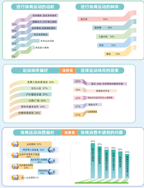 问题则集中在运动场所和管理水平上,部分运动场所可供使用的器械设施数量不足、缺少维护或使用指引不够清晰;部分场所的管理水平偏低,缺乏相应的配套设施或服务;预付式消费存在一定风险等。