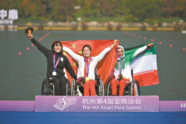 在昨天的皮划艇女子KL1级决赛中,中国队选手谢毛三夺得金牌,这是中国代表团的本届亚残运会的首金,同时也是杭州亚残运会首金。同日,自行车女子B级3000米个人追逐赛在淳安界首体育中心自行车馆举行,广东选手王林花以3分47.781秒成绩刷新亚残运会纪录夺金,这是广东选手在本届亚残运会上获得的第一枚金牌。