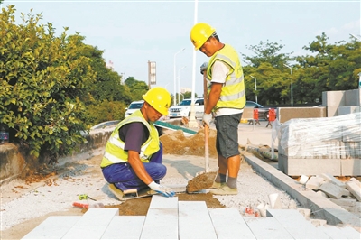 在滨江路的施工现场,施工人员在平整人行道路面、铺设新砖。为解决道路老化、坑洼、开裂、破损等问题,路面修复、拓宽和沥青加铺工程也相继实施。