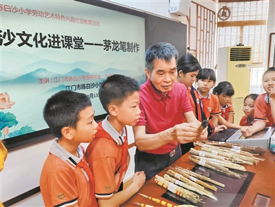 张成富退休后,用自己制作的植物笔,坚持参加社区挥春送福活动,每年义务写春联3000多对;还主动上门为孤寡老人写对联贴对联。10月23日,一场特别的文化传承活动在江门市陈白沙中学举行,活动中,张成富向学生们普及茅龙笔制作的知识,带领同学们亲历剪茅、煮茅、捻茅、系线、削笔过程。