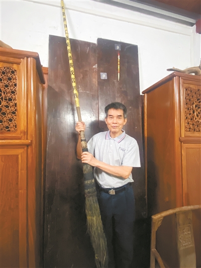 张成富的工作室里摆放着一支2.38米长的茅龙笔,还有17种用不同植物制作的植物笔。