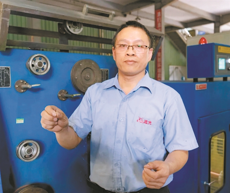 在芯片制程不断朝纳米级缩小的时代,铜丝的拉丝工艺也在向极限发起挑战。作为智能设备电路结构的重要组成部分,铜丝的选择与应用对无人机、智能手机要求的体积小、重量轻的性能有着决定性的影响。“这是一份平凡的工作,但是干一行爱一行,我相信只要付出就会有收获。”陈代平是湖南人,2006年来到清远,进入电缆公司后,成为一名拉丝工人。他很快就喜欢上了这份工作,对于工作中的技术难题,总是刻苦钻研,“遇到问题不解决,睡觉都不踏实”。他笑称,自己最美好的青春年华都献给了这份工作。