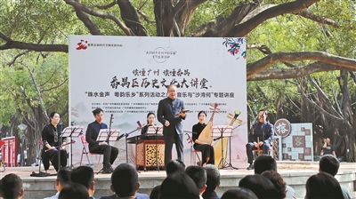 除了讲座,现场广东音乐“五架头”齐上阵,演奏了《雨打芭蕉》《下渔舟》《双凤朝阳》等广东音乐经典曲目。