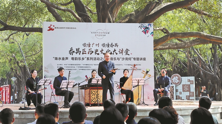 榕树苍翠,粤韵悠扬。10月23日下午,“我们的节日·精神的家园”重阳主题活动——“读懂广州 读懂番禺”番禺区历史文化大讲堂“珠水金声 粤韵乐乡”系列活动之广东音乐与“沙湾何”专题讲座在番禺区大龙街旧水坑榕树头公园举行。讲座邀请国家一级演奏员、著名管乐演奏家、广州市音乐家协会副主席、国家非物质文化遗产广东音乐市级传承人陈芳毅前来讲述广东音乐知识,吸引了众多街坊和傍江东小学学生代表前来观赏。