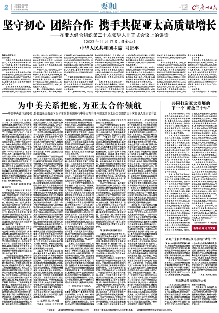 - 为中美关系把舵,为亚太合作领航 新华社北京11月18日电 2023年11月14日至17日,应美国总统拜登邀请,国家主席习近平赴美国旧金山举行中美元首会晤,同时应邀出席亚太经合组织(APEC)第三十次领导人非正式会议。行程结束之际