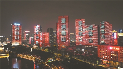 灯光璀璨,光影达意。昨晚,佛山全市各大地标建筑外墙和户外屏幕更是流光溢彩,纷纷亮屏表白志愿者。九鼎国际、千灯湖公园等地标建筑亮起致敬志愿者的标语,点亮城市夜空,弘扬志愿精神,在这个温暖的节日营造出浓厚的志愿文化氛围。