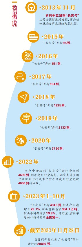2013年11月,首列中欧班列“长安号”从西安国际港站启程,开启“钢铁驼队”跨越亚欧大陆的旅程。2017年3月,从事跨境电商工作的元朝辉夫妇通过“长安号”发出了他们的第一条跨境电商货物集装箱。如今,他们打算让优质的国产新能源汽车搭乘中欧班列,“出海”卖到哈萨克斯坦,甚至整个中亚地区。十年来,乘着共建“一带一路”倡议的东风,“长安号”开足马力,在互联互通、合作共赢的道路上跑得更快更稳更远。