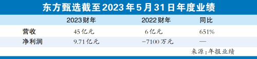 今年8月,东方甄选公布截至2023年5月31日年度业绩显示,2023财年东方甄选营收45亿元,同比增长651%;净利润为9.71亿元,同比扭亏为盈。东方甄选GMV(商品交易总额)达到100亿元,抖音上第三方产品及自营产品的已付订单总数为1.36亿单。2023财年,东方甄选自营产品及直播电商分部的总营收为39亿元,占总营收86.7%。2023财年,东方甄选主要的业务板块包括自营产品及直播电商业务、大学教育以及机构客户等。