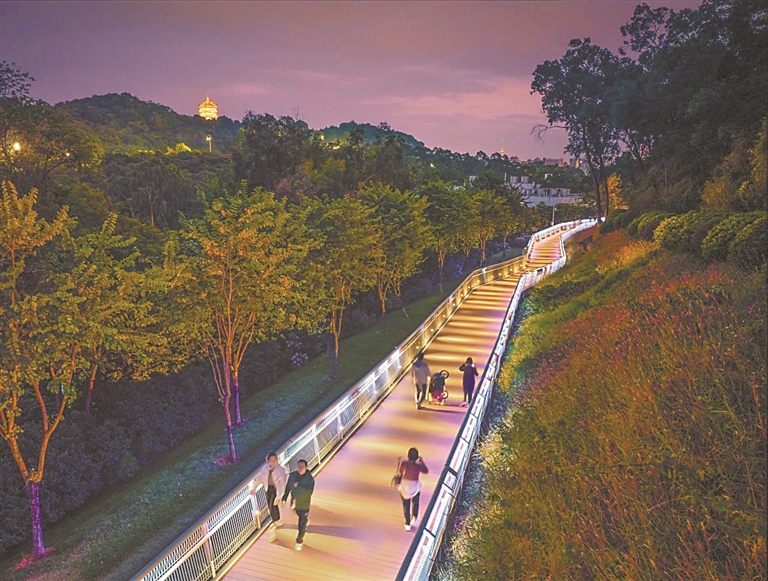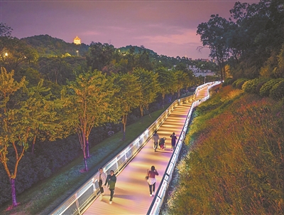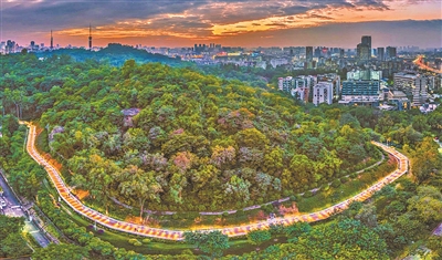 夜幕降临,华灯初上,在白云山风景区麓湖公园云道,流光溢彩,霓虹变幻,璀璨的灯光倾洒而下,一盏盏路灯和景观灯发出柔美的光亮,宛若一条“彩龙”穿梭于城市森林中,照亮了登山市民的张张笑脸和幸福生活。