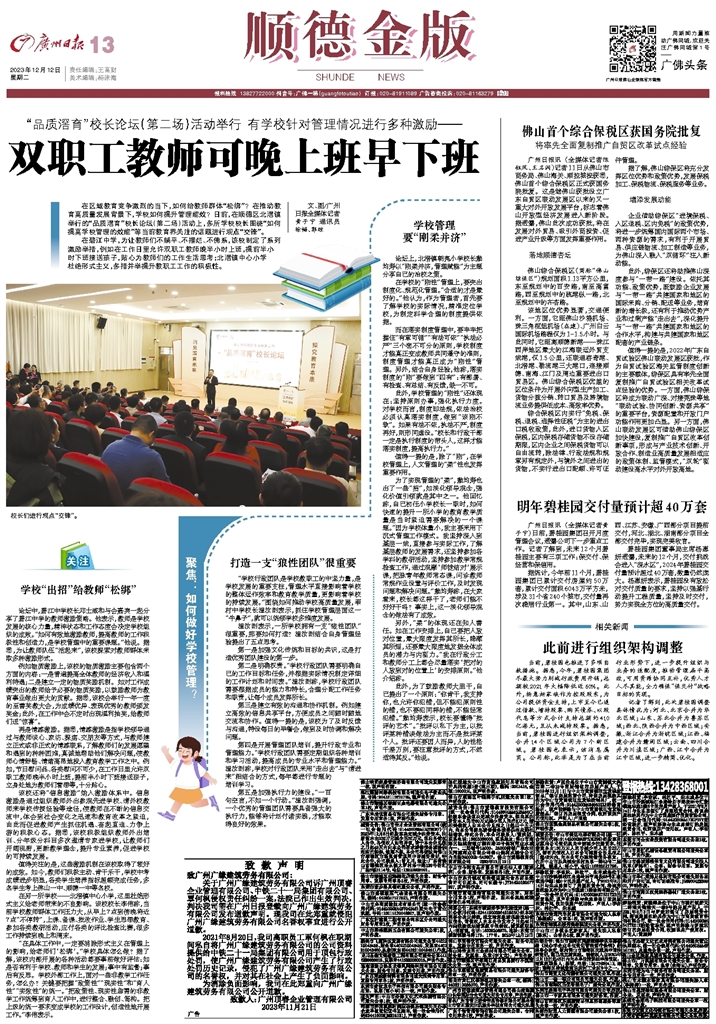 - 双职工教师可晚上班早下班 在区域教育竞争激烈的当下,如何给教师群体“松绑”?在推动教育高质量发展背景下,学校如何提升管理能效?日前,在顺德区北滘镇举行的“品质滘育”校长论坛(第二场)活动上,多所学校校长围绕“如何提高学校