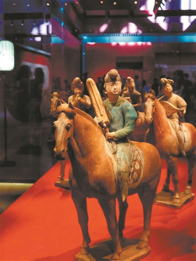 在金乡县主合葬墓中出土的彩绘狩猎骑马俑和牵驼、牵马俑中,大多是高鼻多须的胡人形象,骑马鼓吹仪仗俑和骑马伎乐俑手中多有筚篥、胡笳、琵琶、箜篌等胡乐乐器,从中可一窥盛唐时期中外交流的盛景。