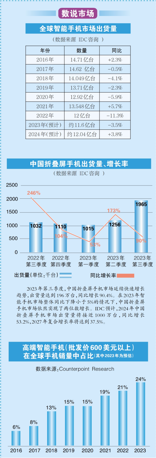 据记者观察,2024年,手机厂商将投入更大的力量开拓新兴市场。“OPPO的海外销售占比已超60%,在20个国家和地区的市场份额排名前三。”开年的第一场手机发布会上,OPPO首席产品官刘作虎说。vivo执行副总裁、首席运营官胡柏山更预测:“今年国内手机行业企稳,而海外对手机的需求还会增加,整个手机行业会往上走。” 中国企业扬帆出海,有望觅得一片新天地。以中国、中东和非洲 、印度等为引擎的新兴市场,为全球智能手机市场带来了新活力和新希望。