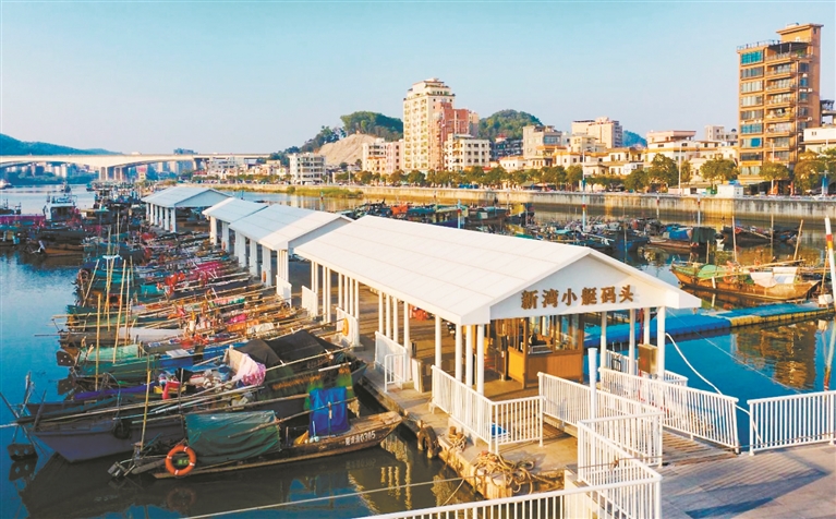 升级改造后的新湾小艇码头,面貌焕然一新。新建的无障碍坡道,方便渔民及游客的出行;风雨长廊下的码头水上平台也加设了栏杆、放置了消防器材,可降低人员落水风险和保障消防安全。傍晚6时,夜幕降临,静静矗立在码头的橙白色灯塔亮起灯光,指引着渔民归航的方向;风雨长廊的霓虹灯光倒映在水面,增加了一种迷人的色调,为码头增添了一份浪漫。