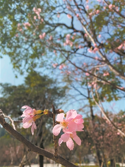 在西樵山天湖广场旁,粉嫩樱花也唯美亮相。阳光下的朵朵樱花,粉嫩迷人,整个天湖公园都弥漫着粉色浪漫。樱花最佳观赏期是1月下旬至2月中旬。