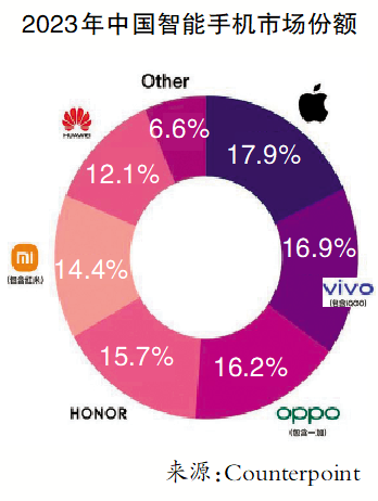 记者观察到,在中国市场,苹果的“榜一”优势已缩小。Counterpoint研究数据显示,2023年中国智能手机市场中,苹果以17.9%的份额居榜首,vivo凭借16.9%的市场份额夺得国产手机品牌头名,OPPO(16.2%)、荣耀(15.7%)紧随其后,小米(14.4%)、华为(12.1%)、真我(1.9%)分列总排名5-7位。在IDC的中国智能手机排行中,苹果虽然排名第一,但与第二名的荣耀差距缩小至0.2个百分点,而排名第三的OPPO也显示出品牌韧性,全新推出的Find N3系列在竖折细分市场登顶该市场份额第一。因此总体来说,国内厂商业绩稳健,已对苹果、三星形成“合围”态势。