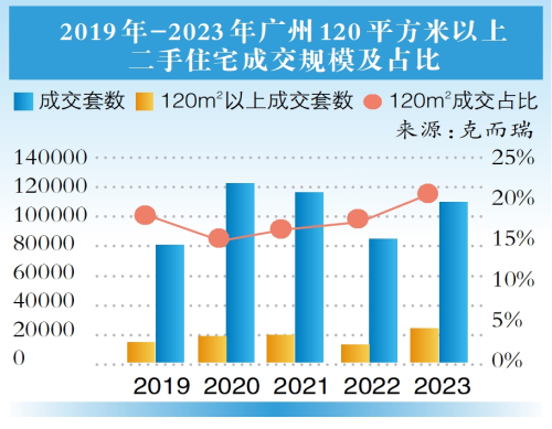 与此同时,不同类型的产品获益程度将明显不同。实际上,改善需求主导的趋势正在从一手向二手市场传导。克而瑞数据显示,2023年广州120平方米以上二手住宅共成交了21221套,占二手住宅成交总规模的20%,这一比例较2021年提升了近5个百分点。
