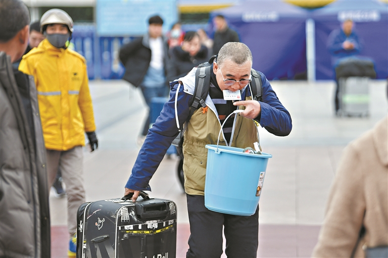 在过去,摩肩接踵、肩扛手提大包小包、嘴里叼着火车票的旅客是摄影记者镜头中最爱记录的瞬间;而今,人们的生活水平提高了,人潮虽拥挤却有序,大多旅客仅带着一个大号行李箱加几盒精美特产便可“轻装”出行。网络、物流的发达,让乘客得以将沉重的行李及“心意”提前寄回目的地。