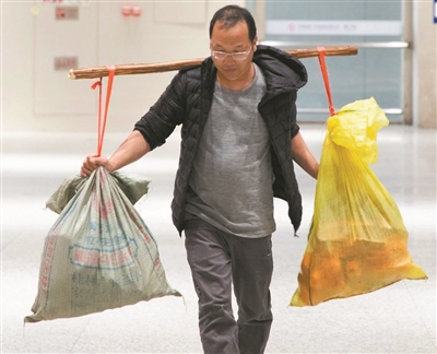 在出站口,一位旅客格外显眼,他一人挑着两大袋土特产,缓缓地从人流中走过。
