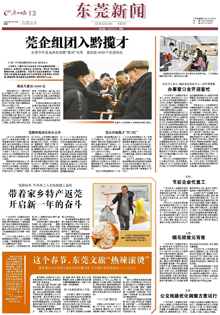- 莞企组团入黔揽才 文、图/广州日报全媒体记者李直建 通讯员莞宣 正月初五,入黔的G2138次列车6号车厢里满是莞味——东莞的人、东莞的音、东莞的企、东莞的岗。甲辰年,莞企揽才蓄势的步伐,从这里开始。东莞市人社局