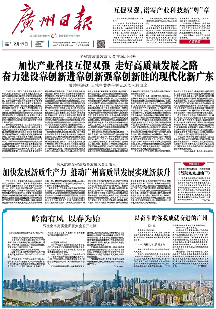 - 互促双强,谱写产业科技新“粤”章 广言快评 开工即开跑,高质量发展“拉满弓”! 2月18日,龙年春节假期后的首个工作日,广东再次吹响了高质量发展的集结号。全省高质量发展大会在深圳召开,政府、企业、科技教育界人士齐聚一堂,共