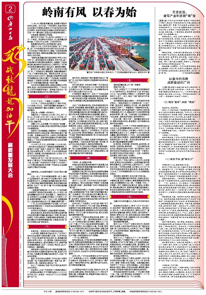 - 以奋斗的你我成就奋进的广州 (上接1版)国家大战略引领、城市大谋划布局、市场大空间支撑、投资大项目带动,一项项工作、一件件实事均落脚在培育新质生产力。广州将牢记嘱托、勇担使命,越山向海、全力以赴,一步步细化新征程上“施工图”