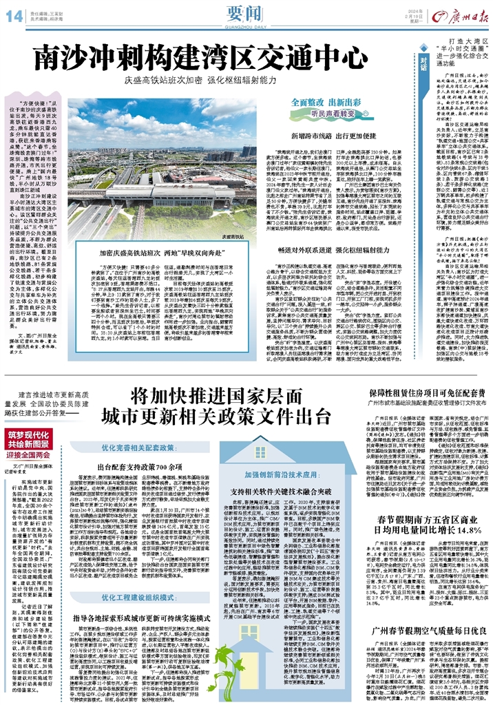- 南沙冲刺构建湾区交通中心 全面整改 出新出彩 听民声看转变 20 “方便快捷!”从位于南沙的庆盛高铁站出发,每天9班次高铁往返香港西九龙,乘车最快只需40多分钟就能直达香港,获往来香港乘客点赞。“这个春节,坐珠