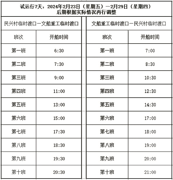 据悉,万顷沙三民岛往返临时轮渡(文船重工临时渡口-三民岛民兴村临时渡口)试运行至2月29日,后根据实际情况再行调整;此外,已将三民岛原“南沙9路”“南沙16路”公交线路终点站调整至文船重工渡口。