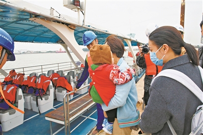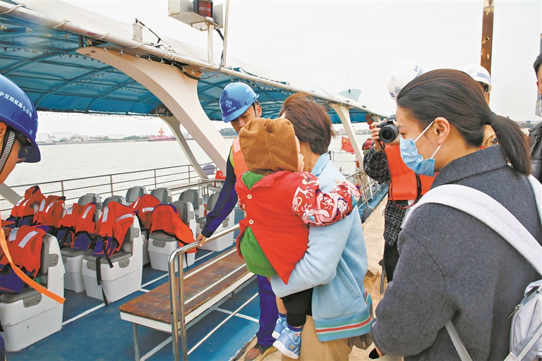 渡船靠岸后,记者排队登上渡船,在工作人员的提醒下,所有人员上船按照规定穿好救生衣并坐稳,随着船长一声“开渡”,渡船缓缓驶离岸边,向着对岸的三民岛驶去。大约10分钟左右,临时渡船到达对面三民岛临时码头,工作人员引导乘客脱下救生衣,有序下船。