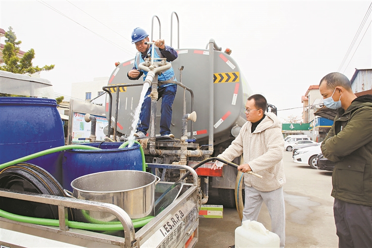 2月23日12点半,记者在南中高速三民岛路段看到,一根长长的黑色通水管道从桥面延伸到地面,这条连夜修建的临时输水管道已投入使用。