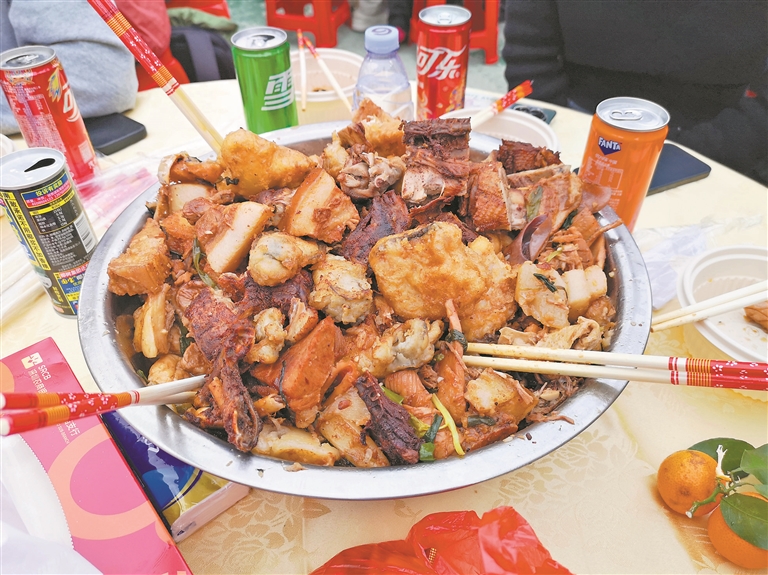 大盆菜宴正式开始。和往年相仿,大盆菜宴的做法是自始至终用一个锅或铜面盆或木盆盛着的一大盆菜。盆里菜色大杂烩,多数为萝卜作菜底,萝卜上铺叠的是蚝、鸡、鸭、炸门鳝、鱿鱼、支竹、油豆腐、炸猪皮、芽菇、木耳、五花肉、鳝鱼干等十五道菜,一层一道菜,一菜一种味道。萝卜寓意“好彩头”置于底层,容易吸收汤汁;依次向上是象征“知足常乐”的支竹、“珠圆玉润”的油豆腐和“东成西就”的焖冬菇;酿蚝豉由于谐音“发财好事”,也是必须呈现的菜式。现在的大盆菜越是上层菜式越是金贵豪华,大虾、鲍鱼、辽参等海味珍馐铺在最上层,象征着富贵荣华。一道大盆菜,夹杂着时间与记忆的味道,总能盘旋在味蕾,再渗入内心。